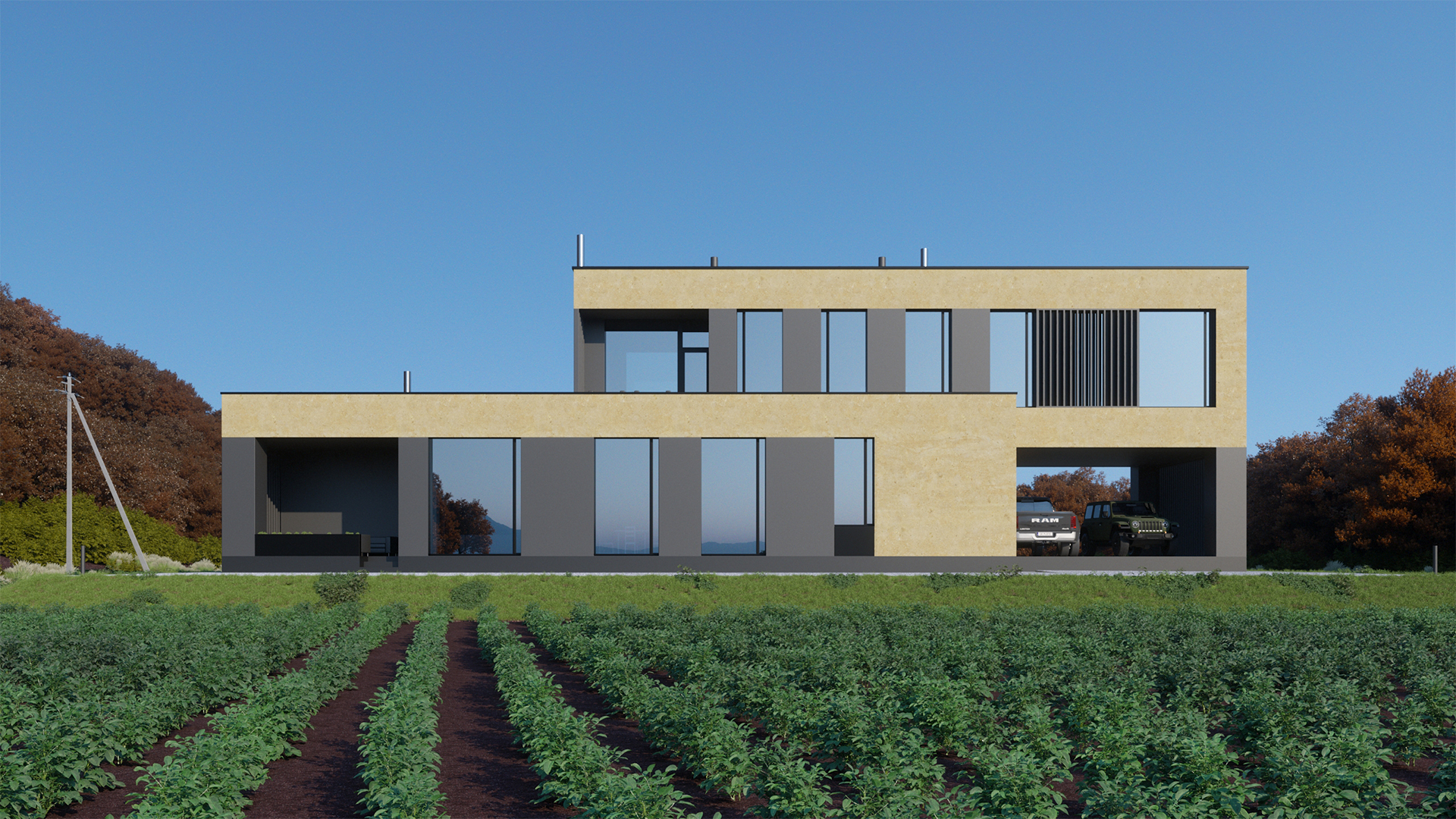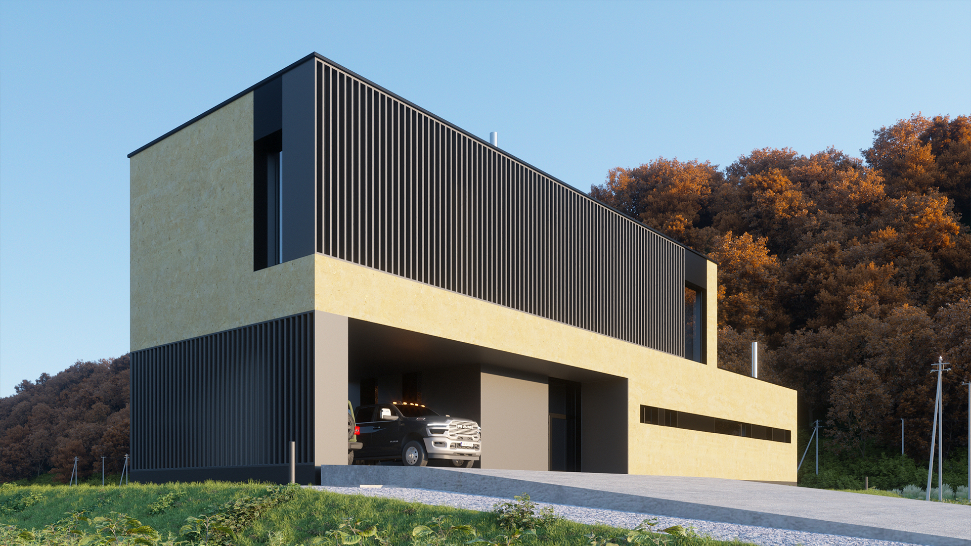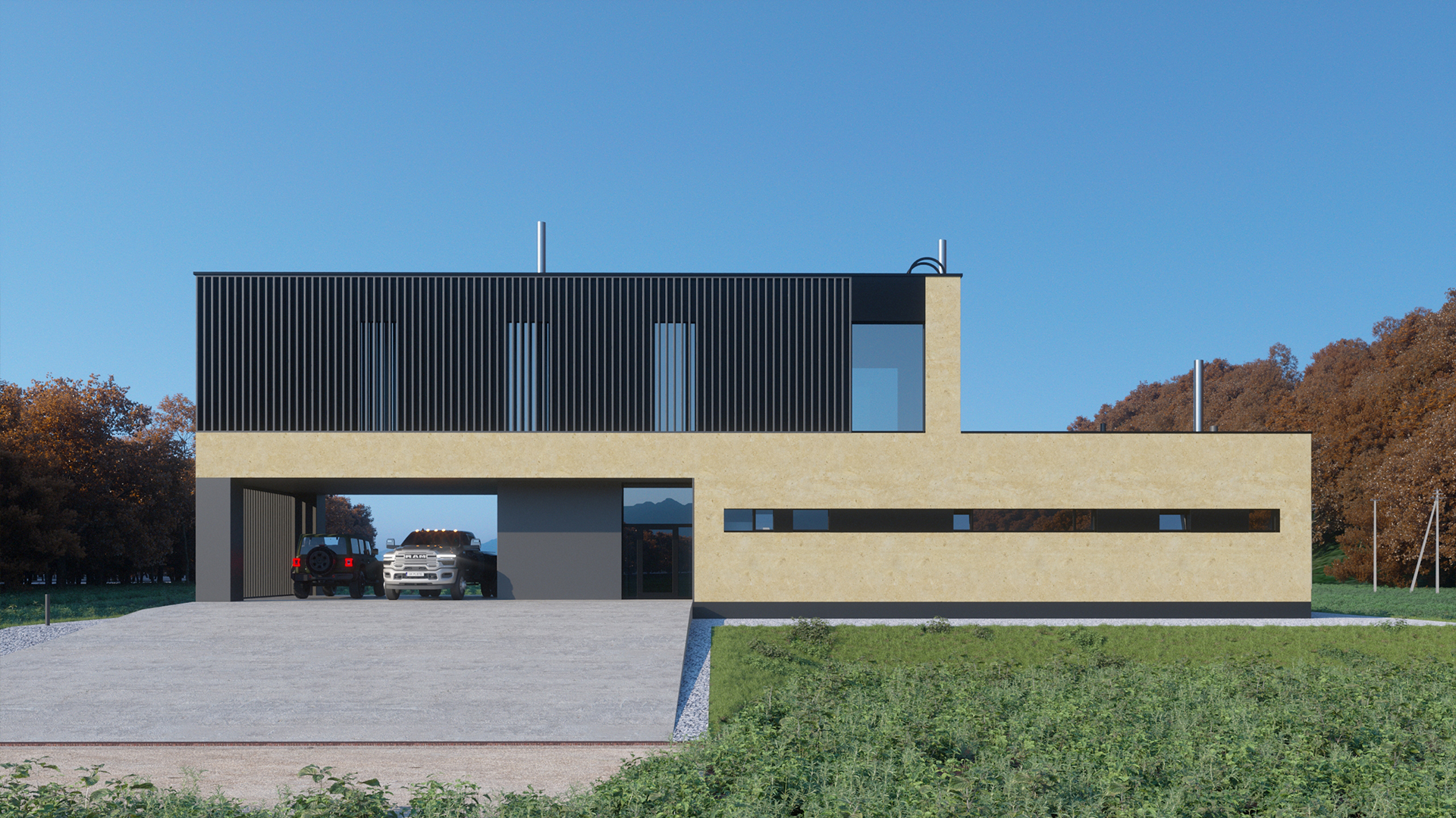 архитектурная композиция выполнена в современном минималистичном стиле. аккуратность внешнего вида достигнута выбором вентилируемого фасада под натуральный извесняк и темный антрацит.