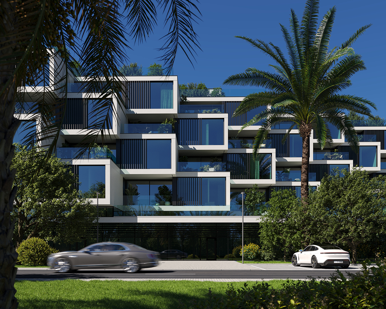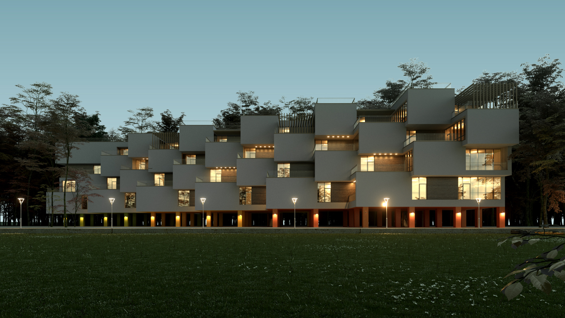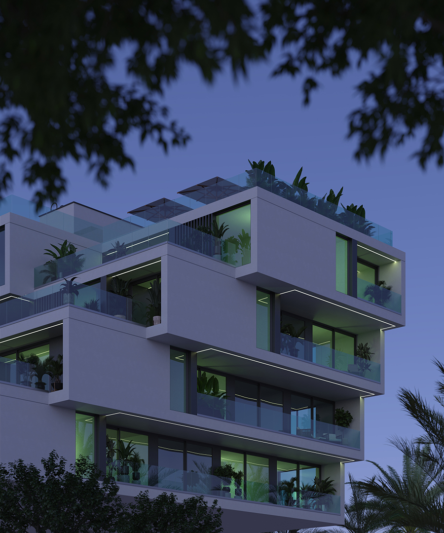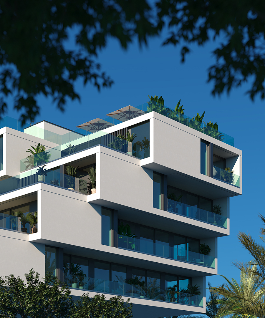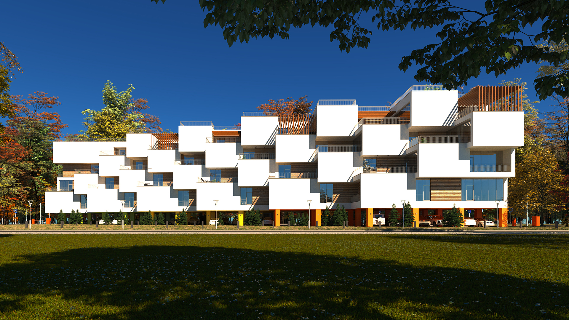 Основной идеей, легшей в основу объемно-планировочного решения, стало наличие у каждой квартиры открытой террасы, что закономерно привело к каскадному смещению этажей, для выразительности силуэта фасад разделен по диагонали на два типа террасирования. Дополнительным вызовом стала необходимость поэтажной проработки планировок квартир с сохранением вертикальности инженерных коммуникаций, мокрых зон и лестнично-лифтовых узлов. архитектурная композиция представляет собой белый объем жилых этажей, парящий над объемом массивного стилобата-паркинга, который также в свою очередь оторван от земли. первый этаж — нежилой, вмещает парадное фойе, въезды в паркинг и коммерческие площади.