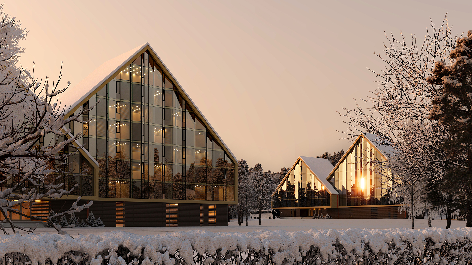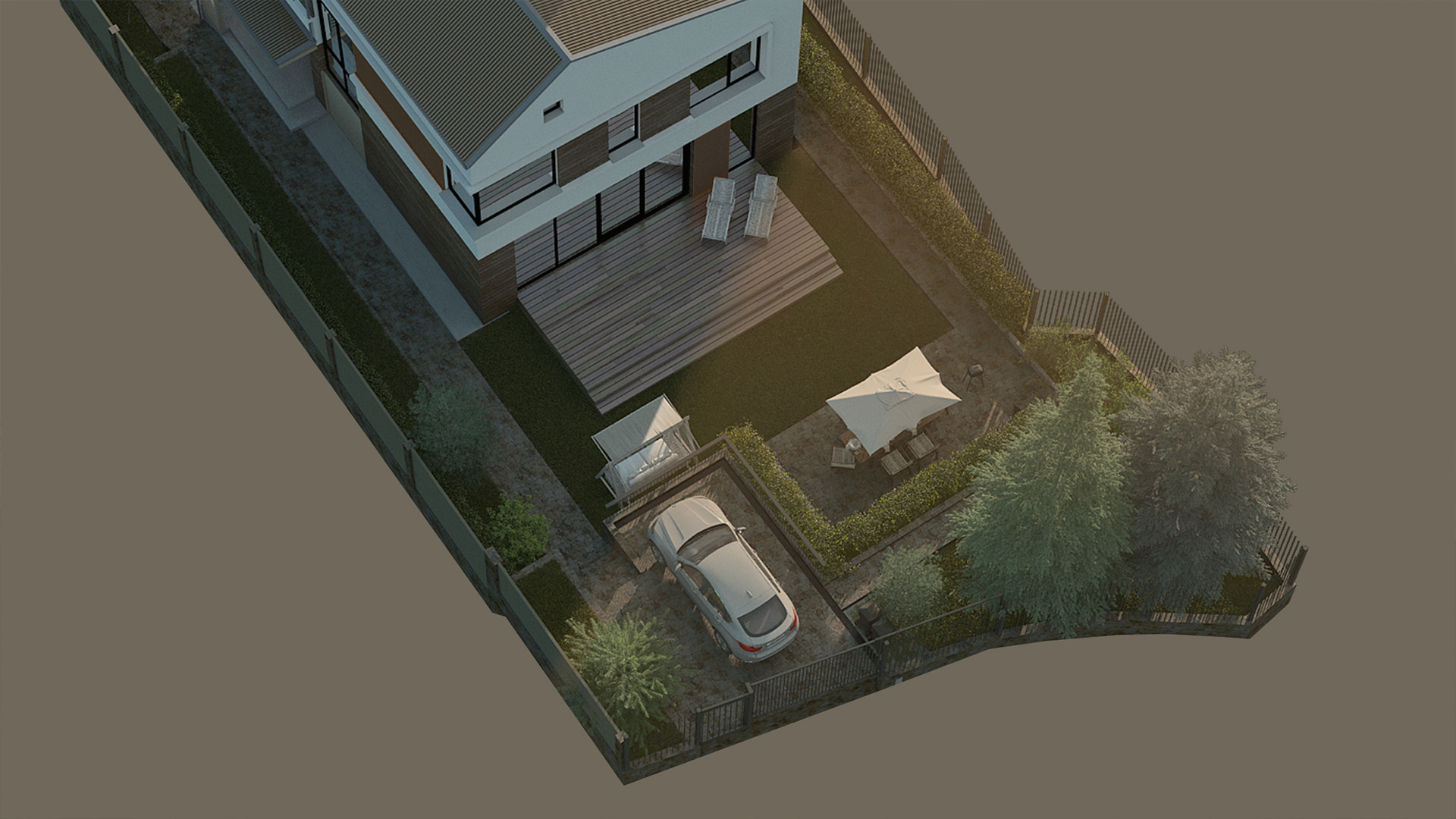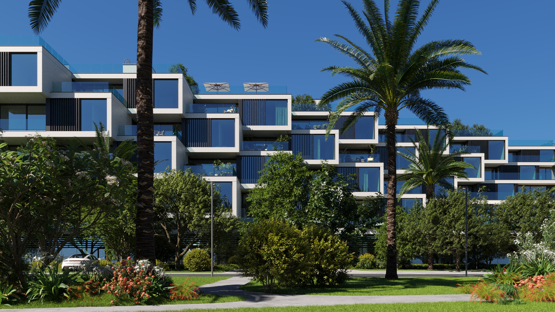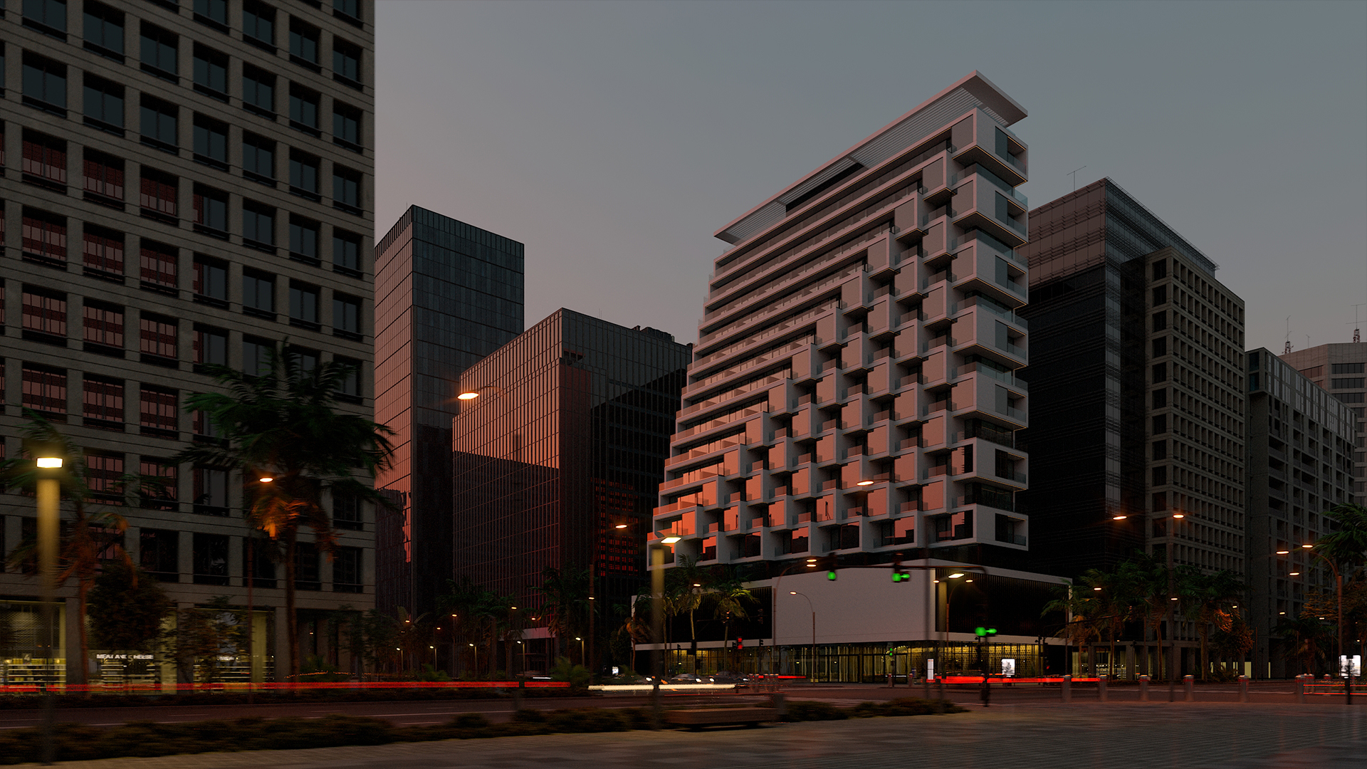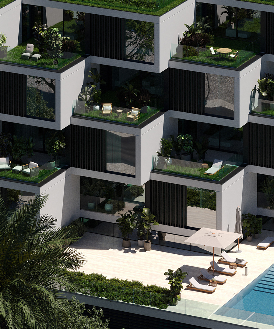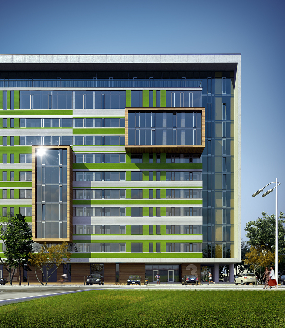 Основной идеей, легшей в основу объемно-планировочного решения, стало наличие у каждой квартиры открытой террасы, что закономерно привело к каскадному смещению этажей, для выразительности силуэта фасад разделен по диагонали на два типа террасирования. Дополнительным вызовом стала необходимость поэтажной проработки планировок квартир с сохранением вертикальности инженерных коммуникаций, мокрых зон и лестнично-лифтовых узлов. архитектурная композиция представляет собой белый объем жилых этажей, парящий над объемом массивного стилобата-паркинга, который также в свою очередь оторван от земли. первый этаж — нежилой, вмещает парадное фойе, въезды в паркинг и коммерческие площади.