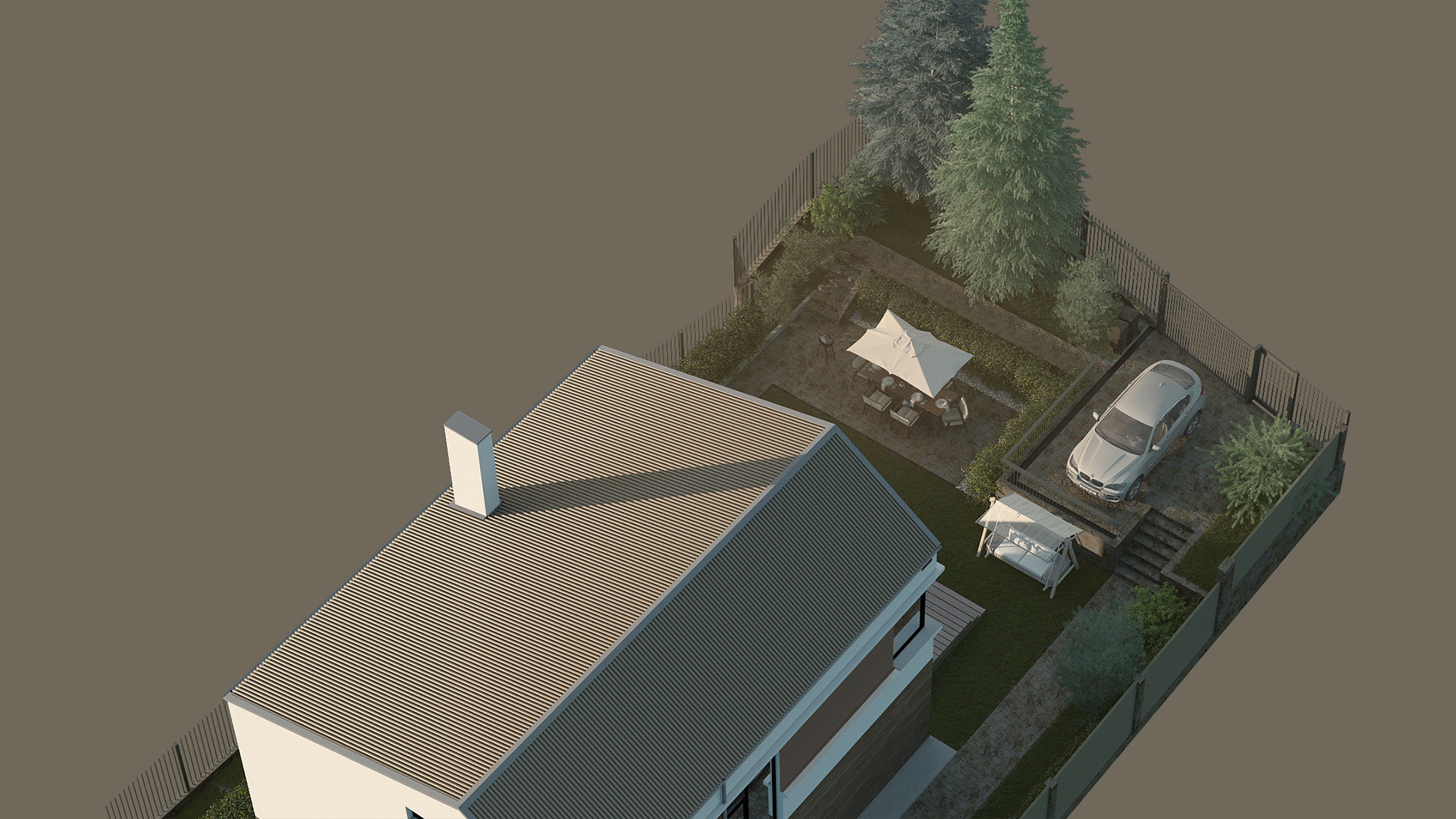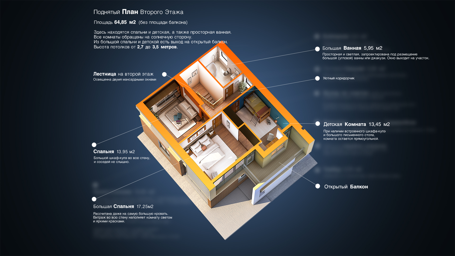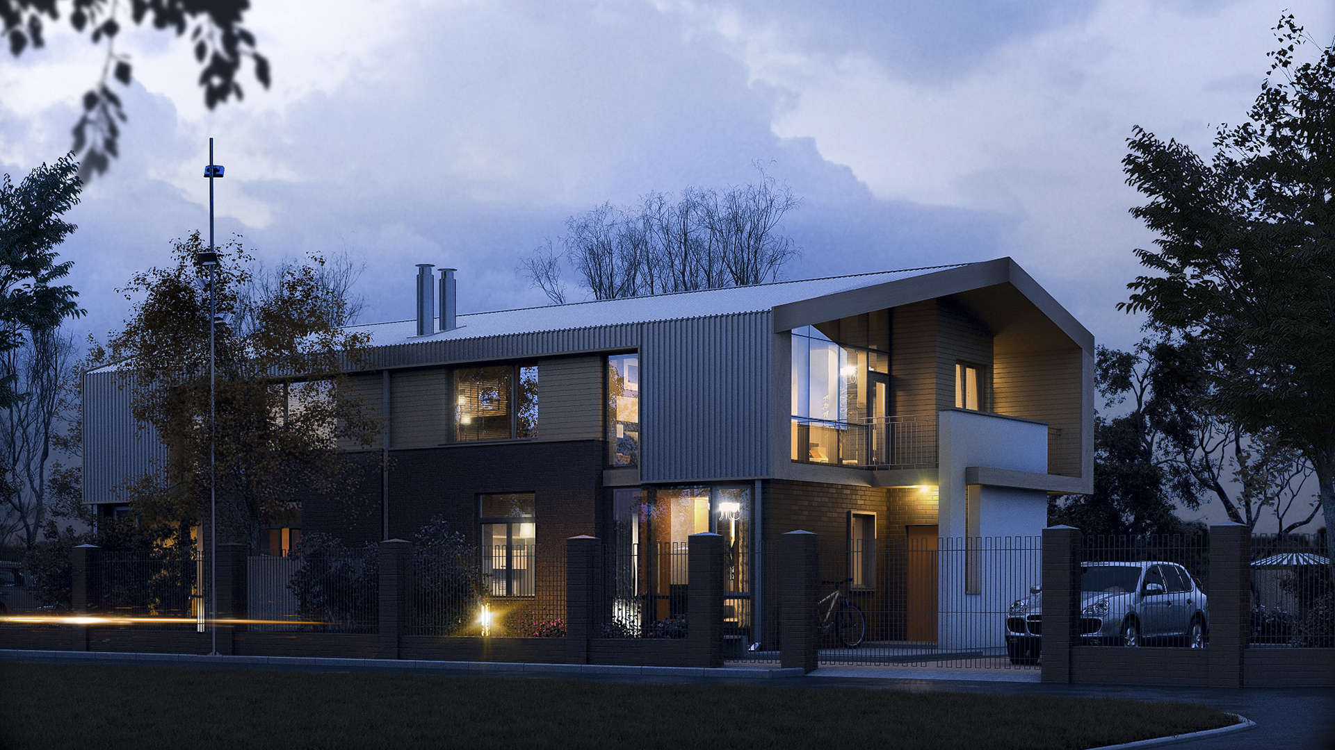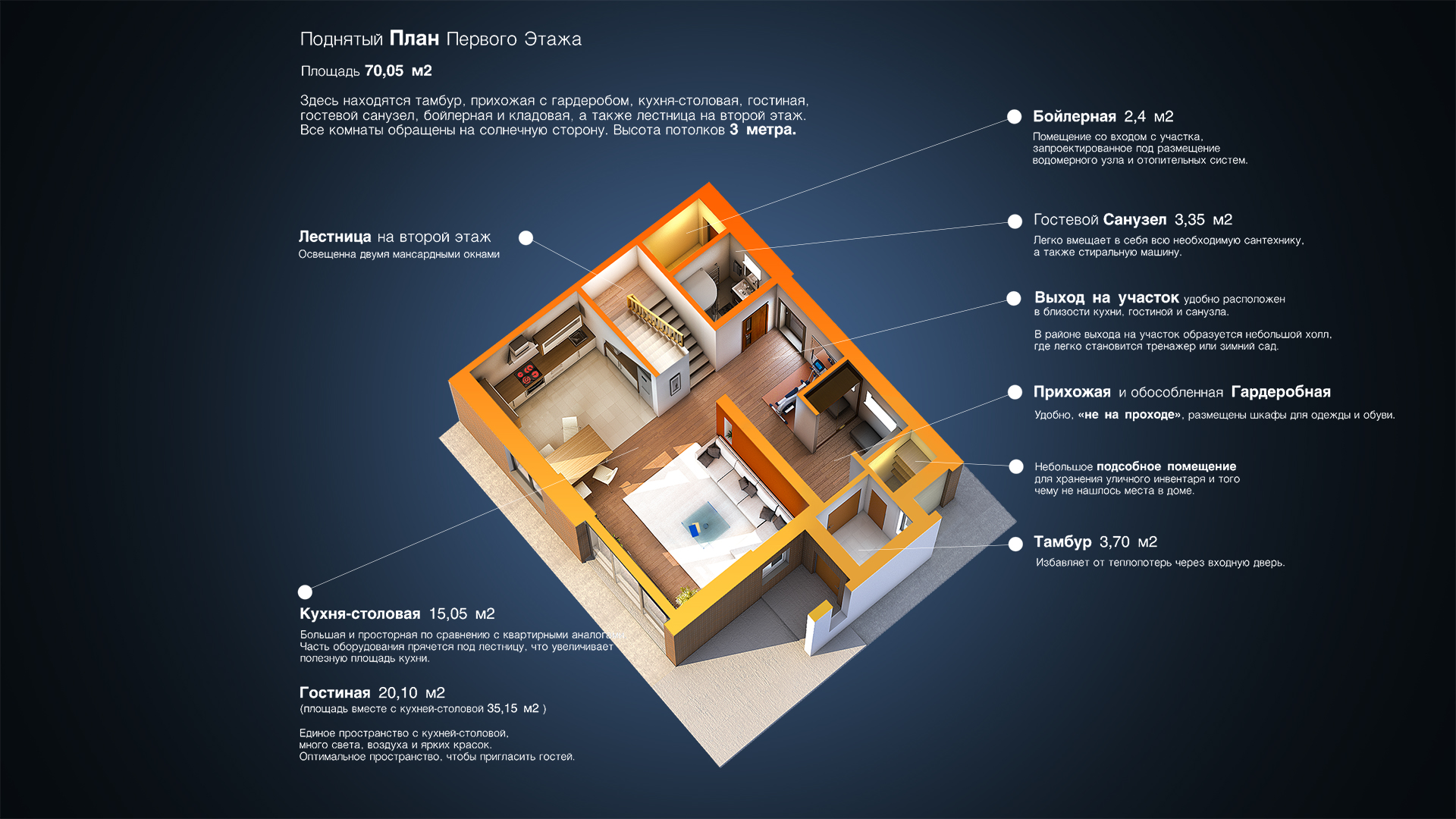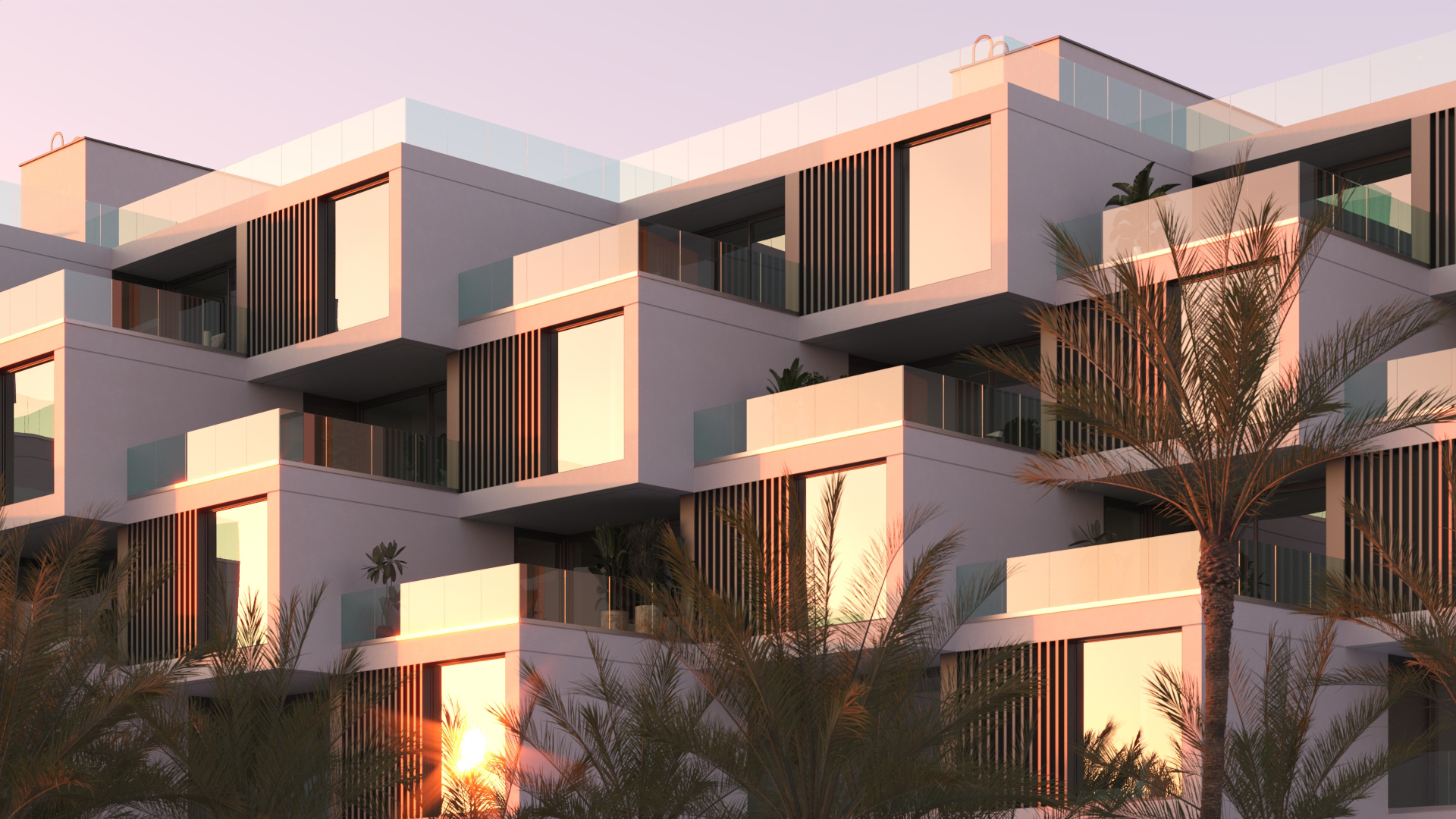Основной идеей, легшей в основу объемно-планировочного решения, стало наличие у каждой квартиры открытой террасы, что закономерно привело к каскадному смещению этажей, для выразительности силуэта фасад разделен по диагонали на два типа террасирования. Дополнительным вызовом стала необходимость поэтажной проработки планировок квартир с сохранением вертикальности инженерных коммуникаций, мокрых зон и лестнично-лифтовых узлов. архитектурная композиция представляет собой белый объем жилых этажей, парящий над объемом массивного стилобата-паркинга, который также в свою очередь оторван от земли. первый этаж — нежилой, вмещает парадное фойе, въезды в паркинг и коммерческие площади.