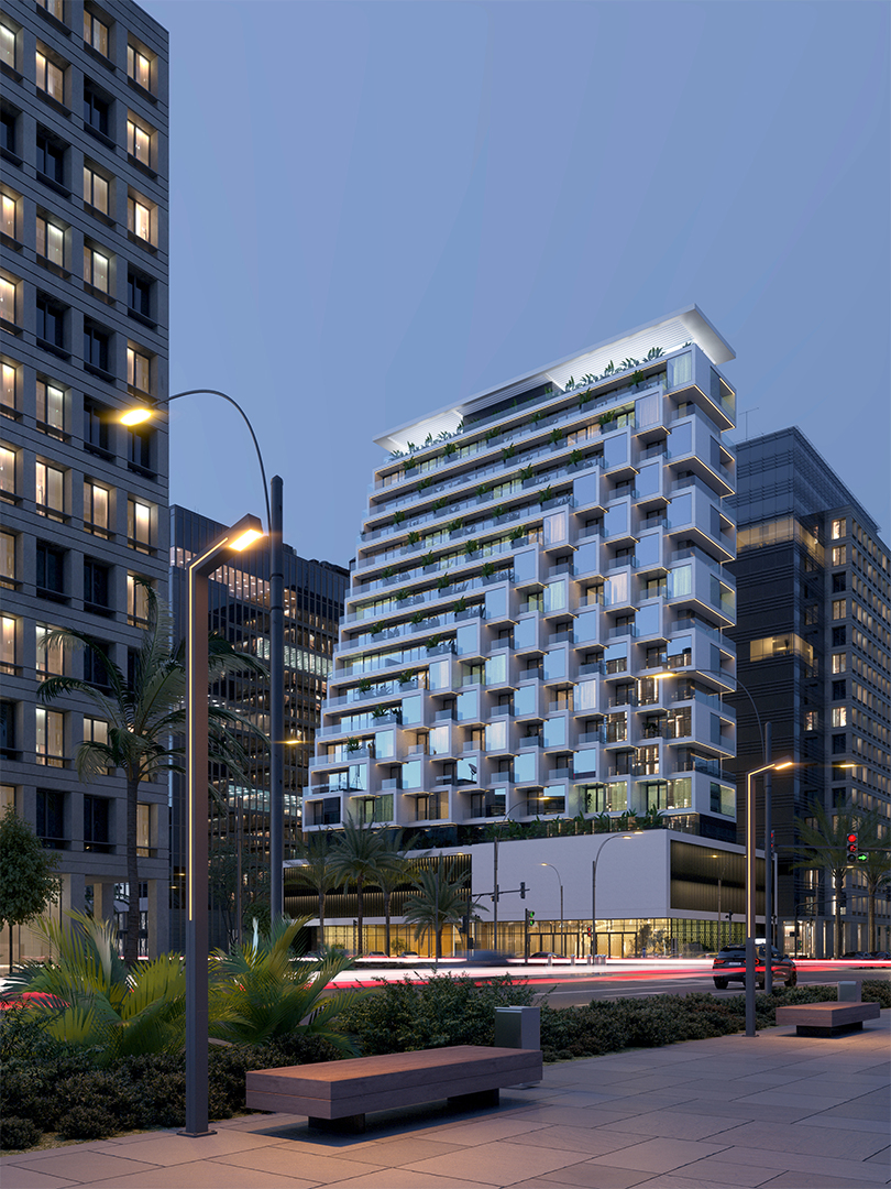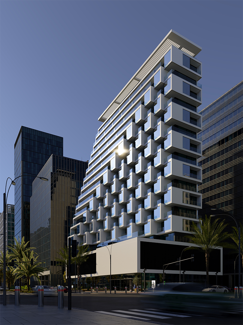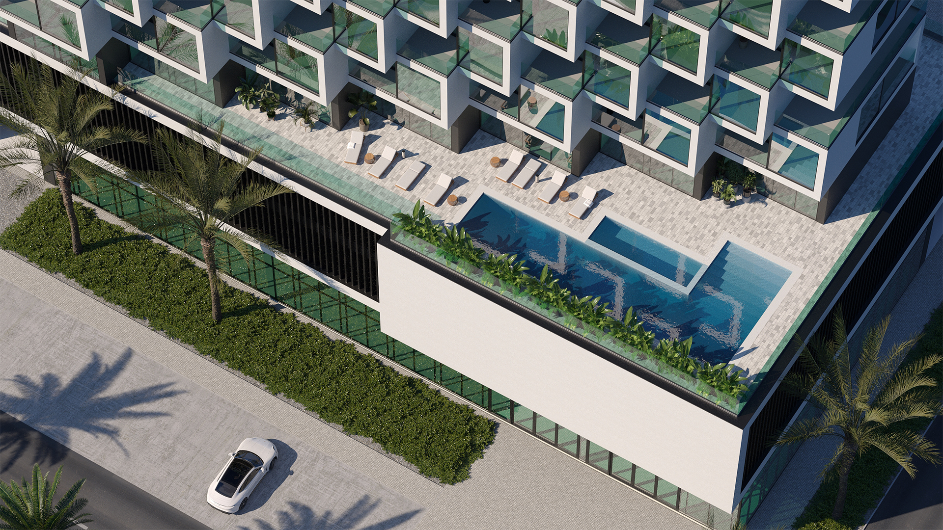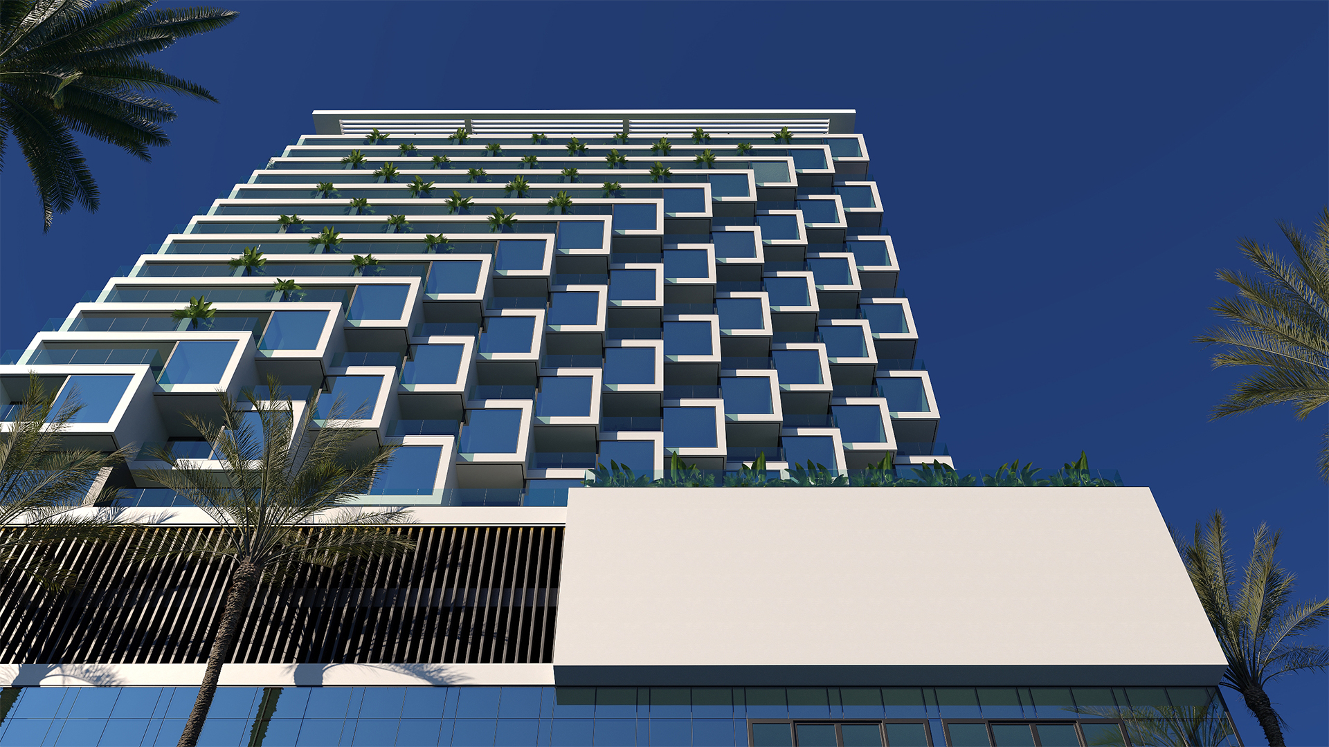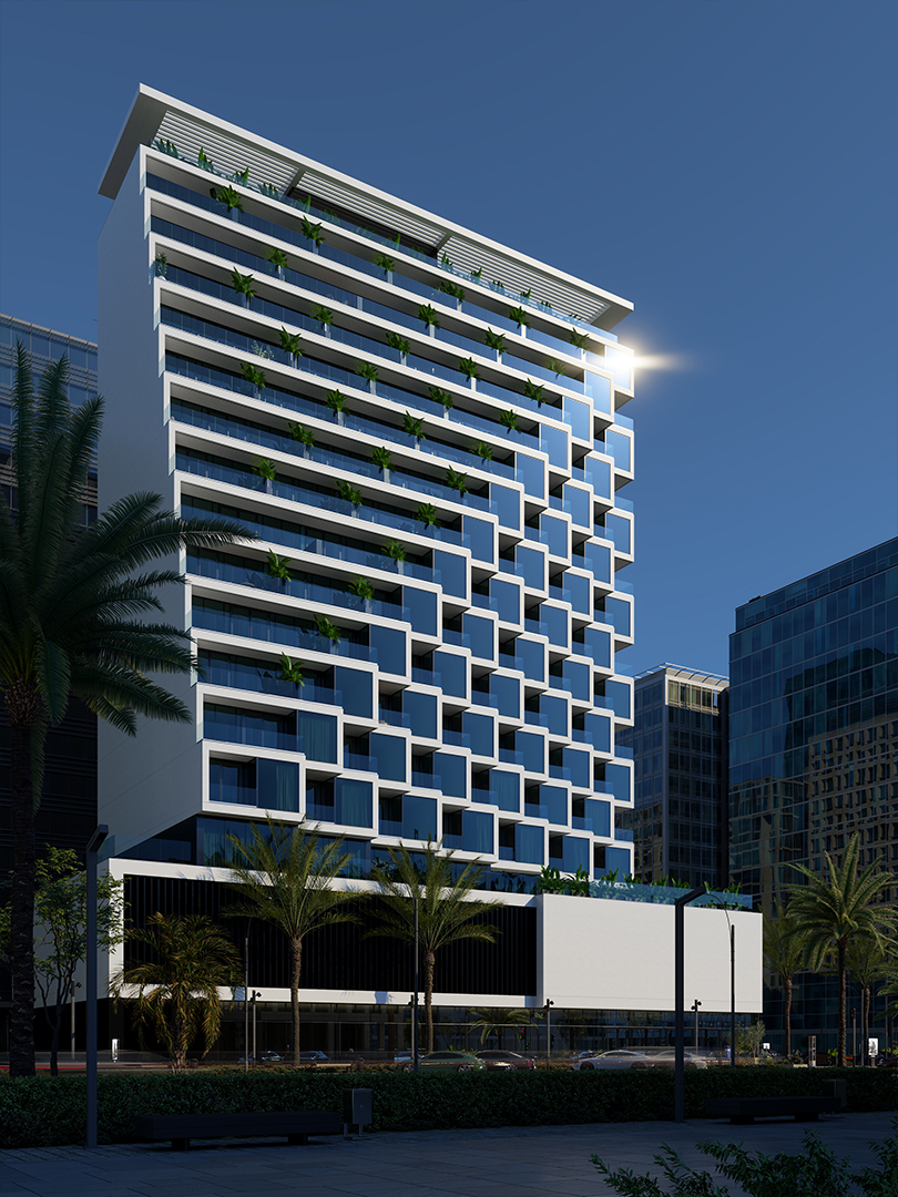 Эскизный проект 17-этажного жилого дома с двухуровневой парковкой, бассейном и эксплуатируемыми кровлями в дубае, оаэ.