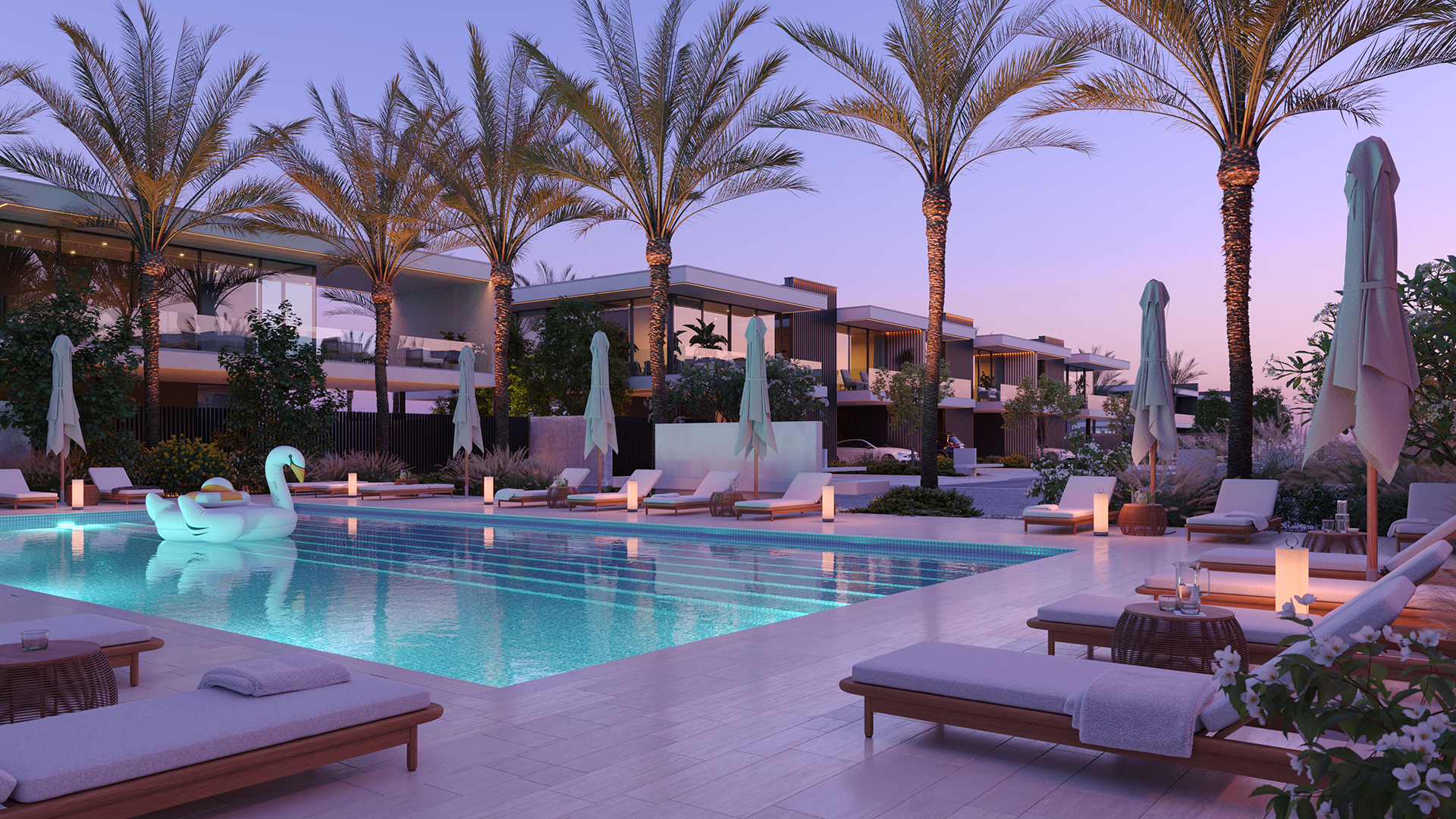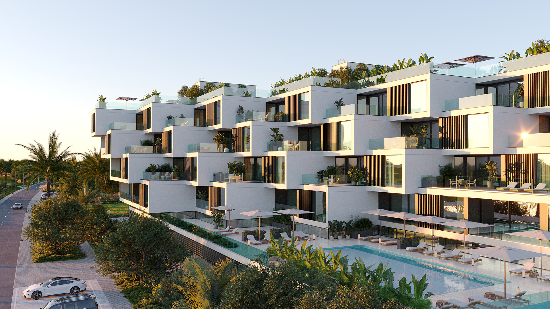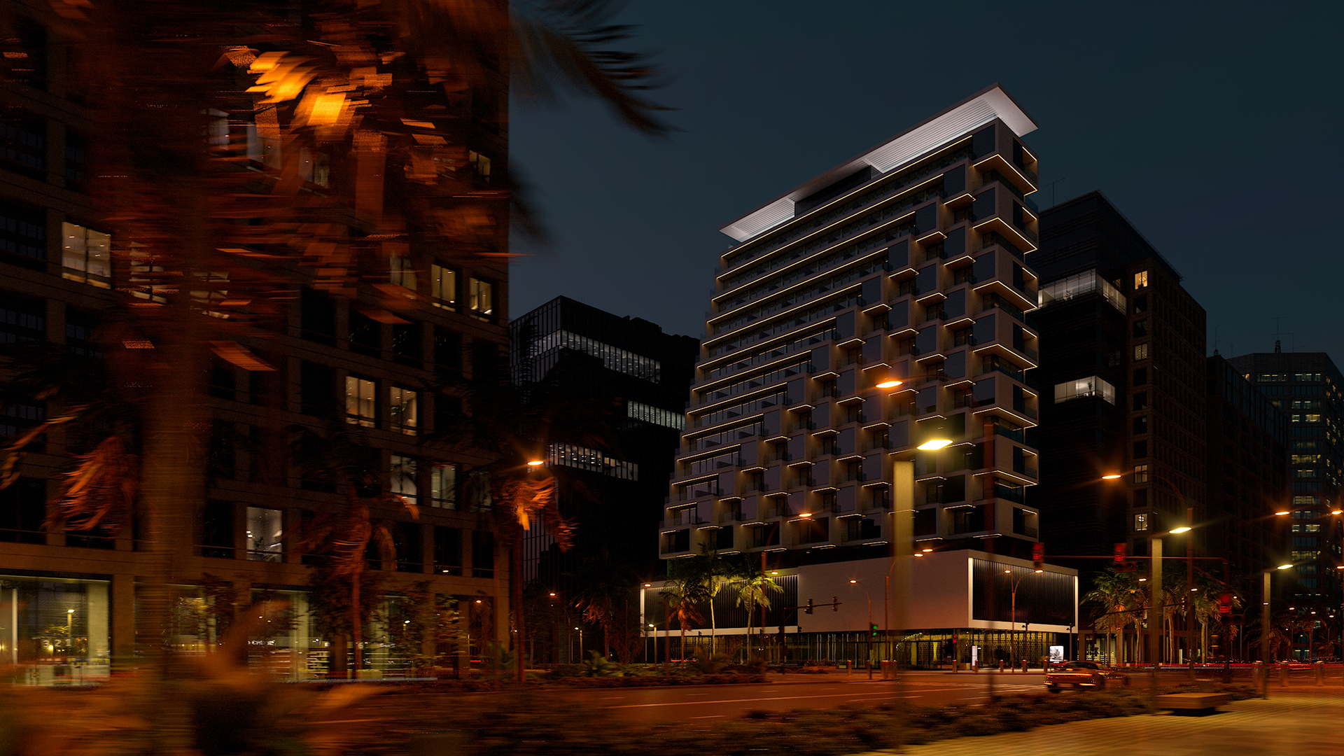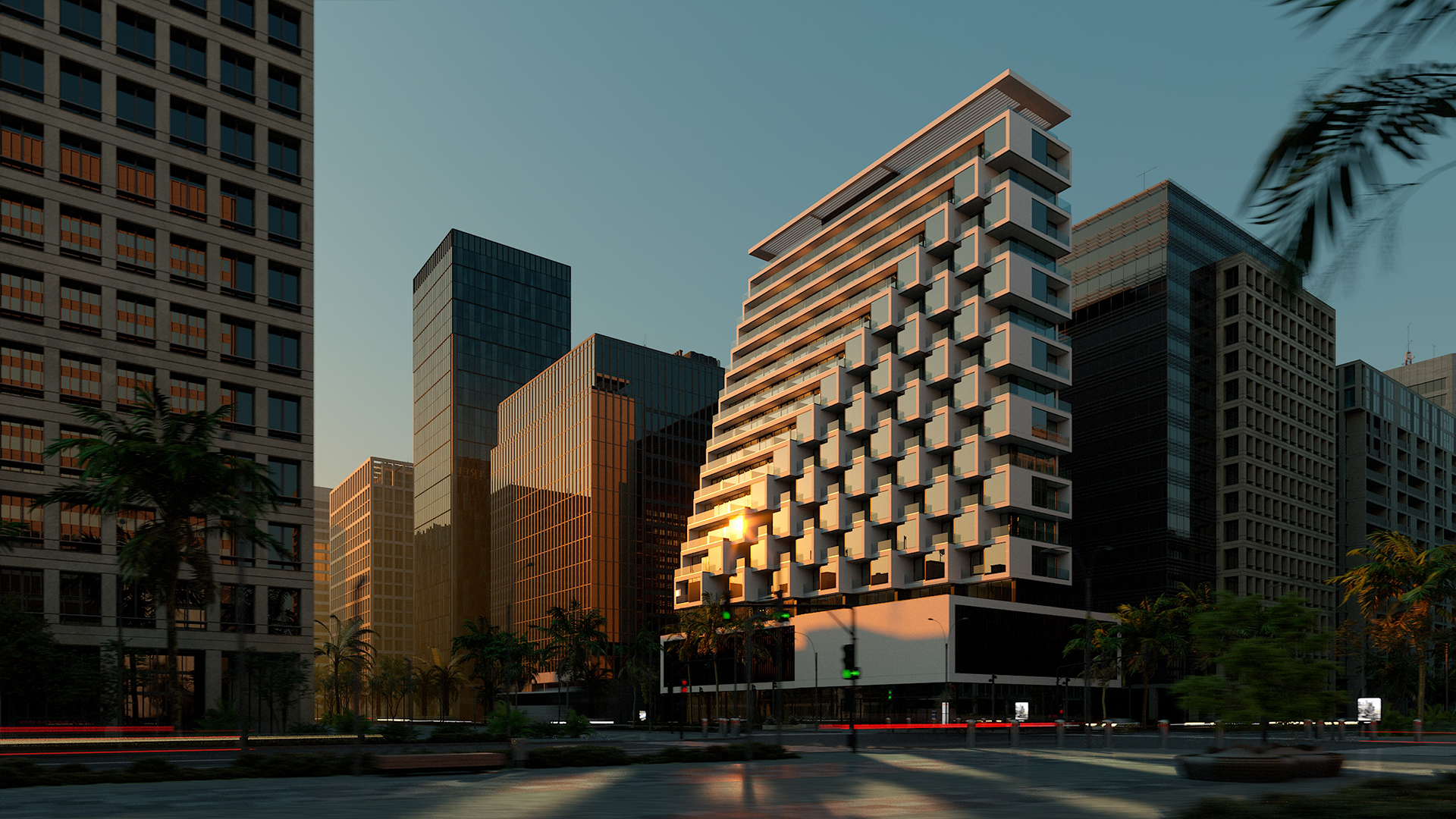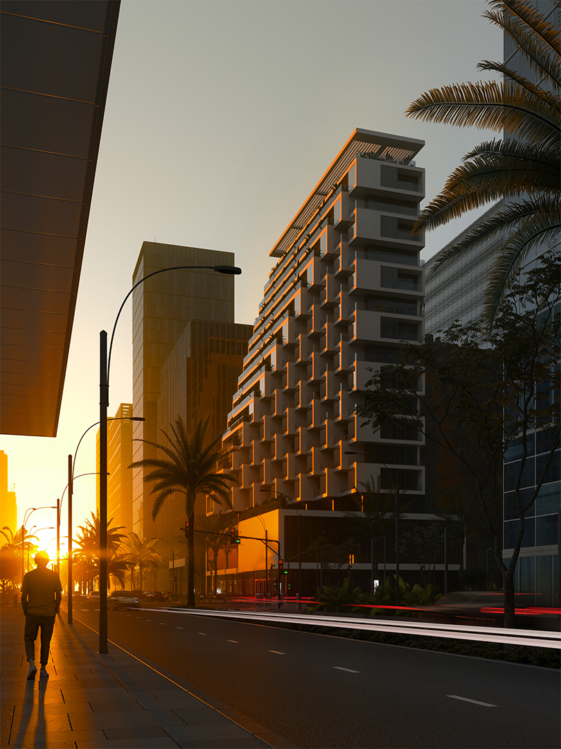 Эскизный проект 17-этажного жилого дома с двухуровневой парковкой, бассейном и эксплуатируемыми кровлями в дубае, оаэ.